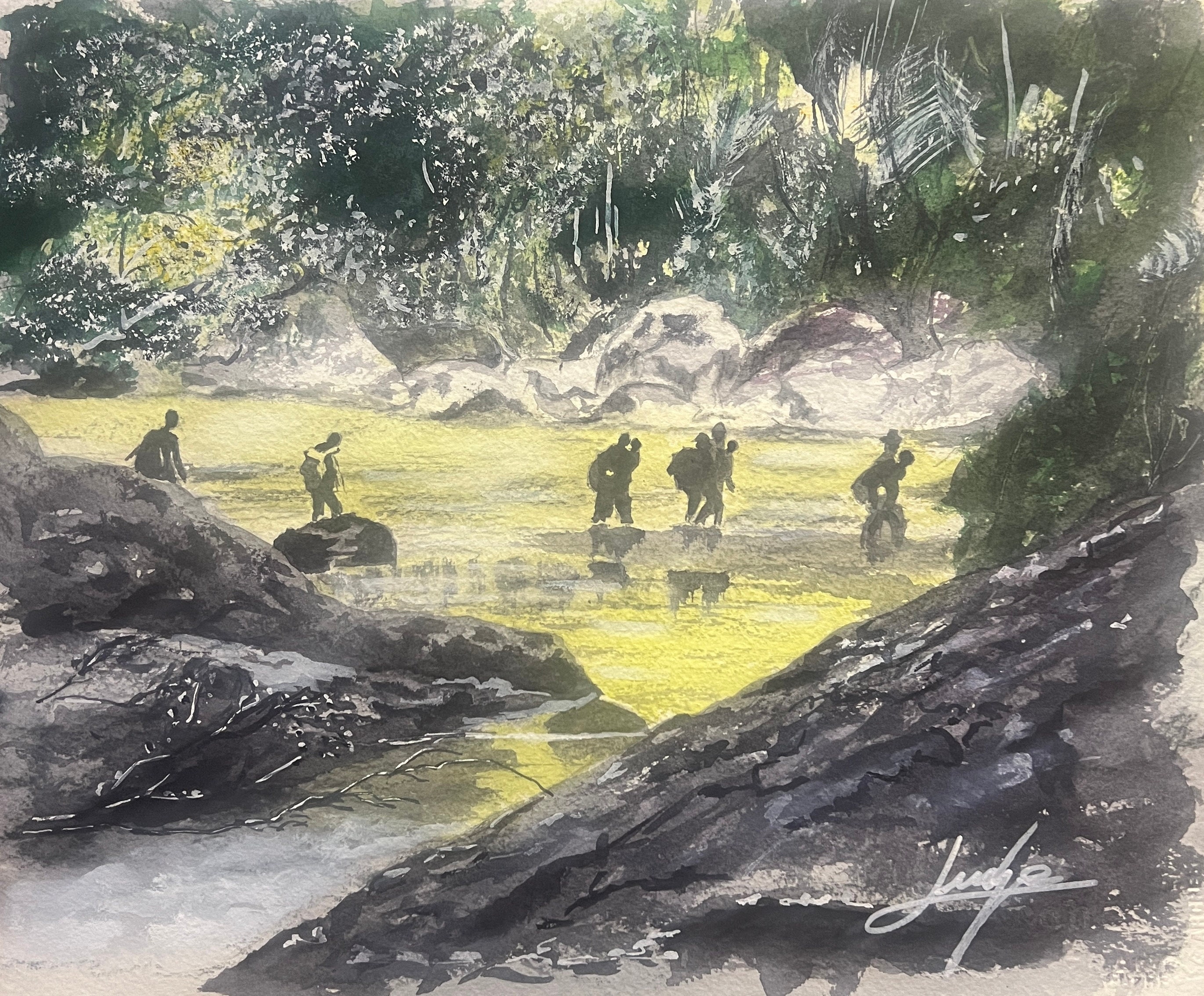 El artista se inspira en una imagen poderosa: un grupo de inmigrantes atravesando un río selvatico . Esta visión se convierte en un testimonio visual del drama de familias enteras, incluidos niños muy pequeños